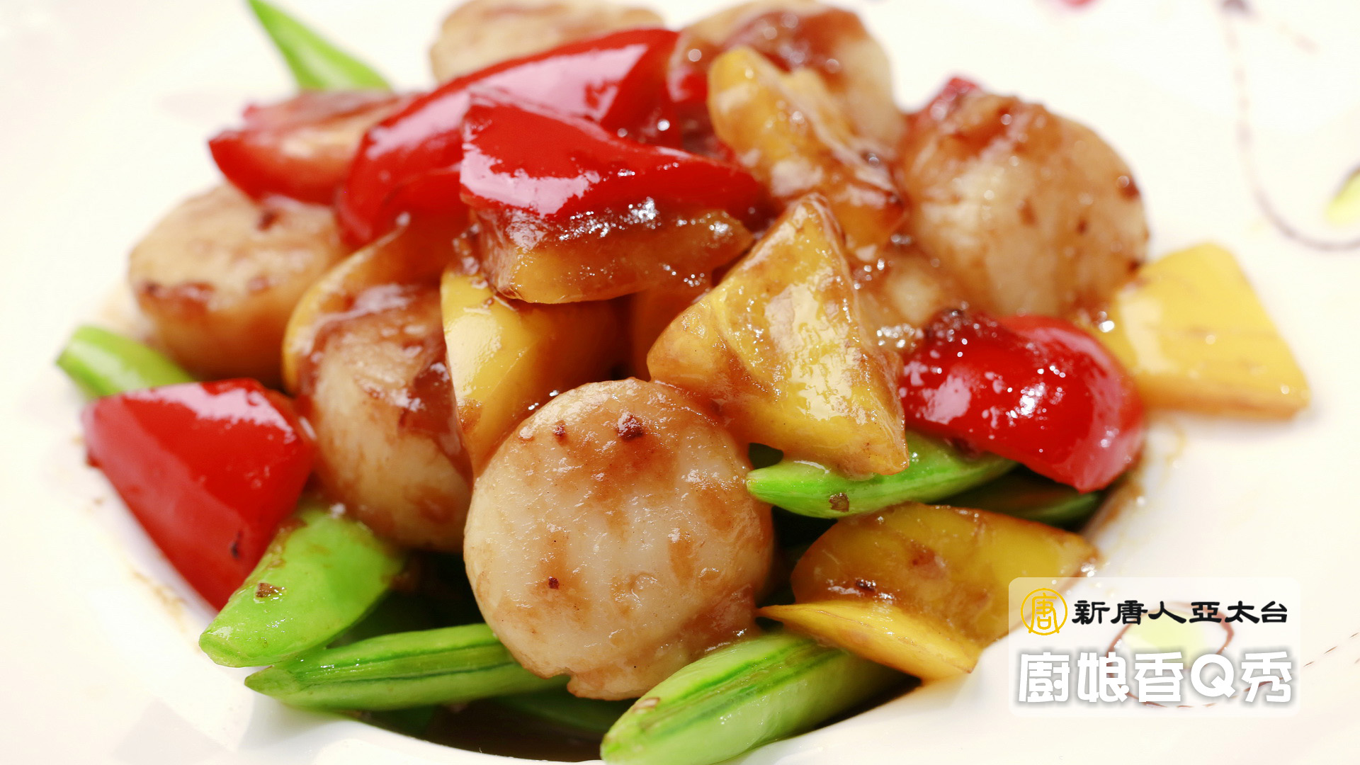 4. 將煎香的干貝加入鍋中熱炒後勾芡,放入紅黃甜椒及海鮮醬,上些許香油提香亮色。將成品盛入已放好甜豆的容器後完成。