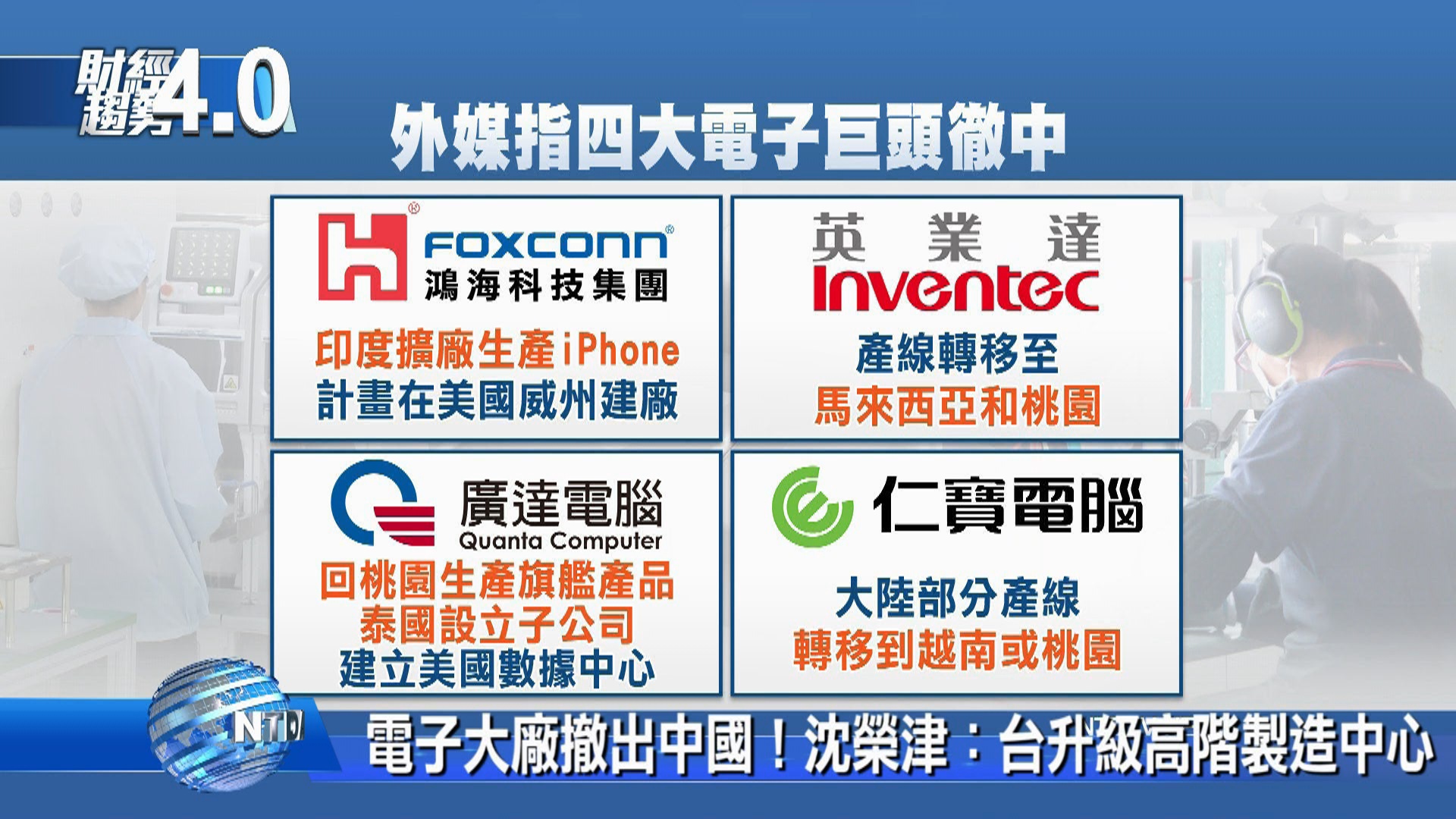 2019-10-08 13:14:01外媒報導,台灣主要電子代工大廠,計畫準備撤出中國,美中貿易戰,也給台灣機會,經濟部長沈榮津就表示,今年台商回流熱烈,不光今、明兩年實際投資4,000億,也將台灣推向「高階製造中心」。
