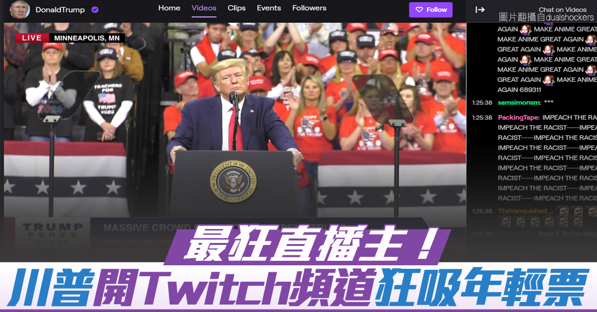 美國總統川普日前加入全球最大電玩實況平台「Twitch」,上線第一個直播就吸引超過7萬名粉絲追蹤。外媒預測,川普為了拚2020年總統大選連任,才將社群版圖從Twitter擴展到電玩直播平台,首上線的影片已累積28萬人次觀看。
