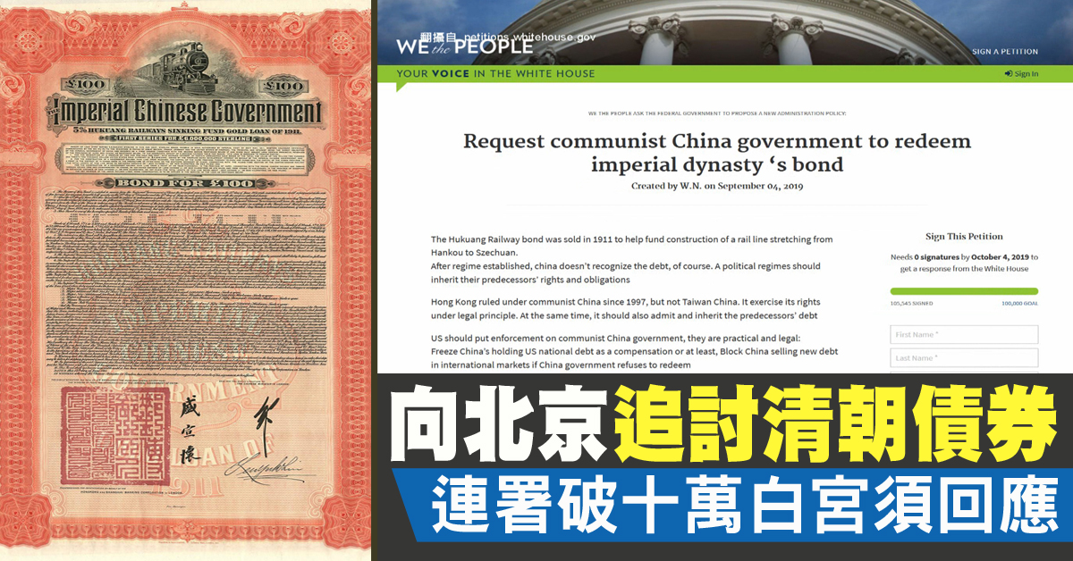 【新唐人亞太台 2019 年 10 月 18 日訊】上個月份,有美國民眾在白宮請願網站上,要求美國政府向中共當局,追索清朝遺留的一筆巨額債務,由於這項提案,獲得10萬人聯署,依照規定,美國政府必須在60天內給予回覆,也給美中貿易談判,添增變數。「彭博社」報導這筆債券是清朝政府1911年,為了資助湖廣鐵路建設所出售的債券,目前價值高達1兆美元。提案內容指出,美國應對北京當局追債,如果中共拒絕,美方應該凍結北京持有的美國國債作為補償,或是要求北京放棄手中持有的美國國債。立委黃國昌8月份也在臉書貼文指出,中華人民共和國向來立場是『不認』這筆債務,尷尬的是,中共堅稱世界上只有一個中國。貼文中引用主權債券專家古拉提(Mitu Gulati)的分析,認為儘管追討程序複雜,在法律上完全是有效的債券。