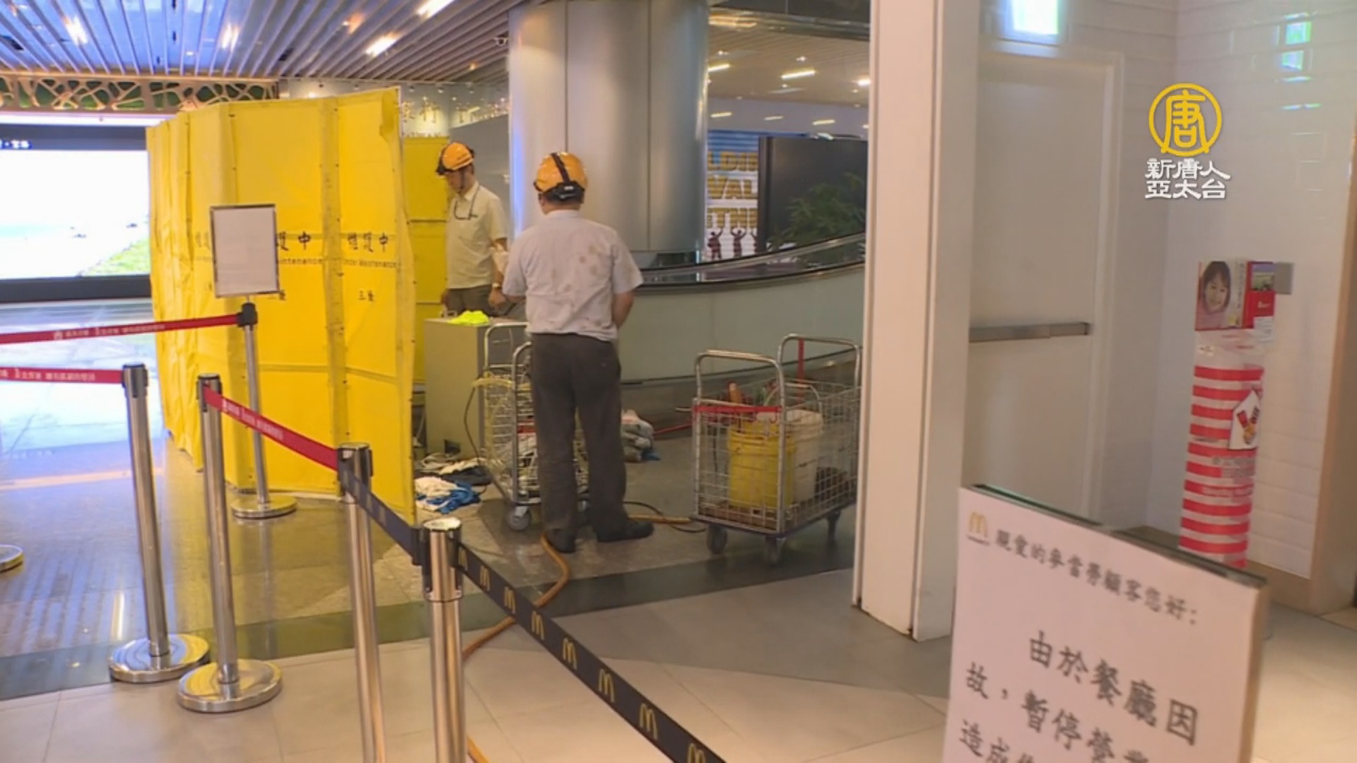 手扶梯維修人員:「它下面那個水(排不掉就對了),太多了,(太多了),看不到啊,(水是從哪裡來也不曉得),我們不知道是從哪邊漏進來的。」