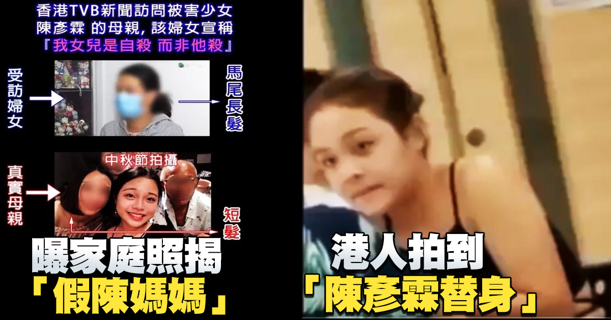 香港15歲女生陳彥霖上月全裸浮屍海上,仍舊疑點重重。警方公佈陳「投海」前的影片,被懷疑找人補拍,網上流出疑似替身演員的影片。港人還曝光家庭舊照,質疑現身親共港媒的「陳媽媽」也是替身。還有最早在網路上關注事件的吳子明,踢爆陳彥霖的母親及舅父上月早已失聯,受訪的女子非陳彥霖母親本人。