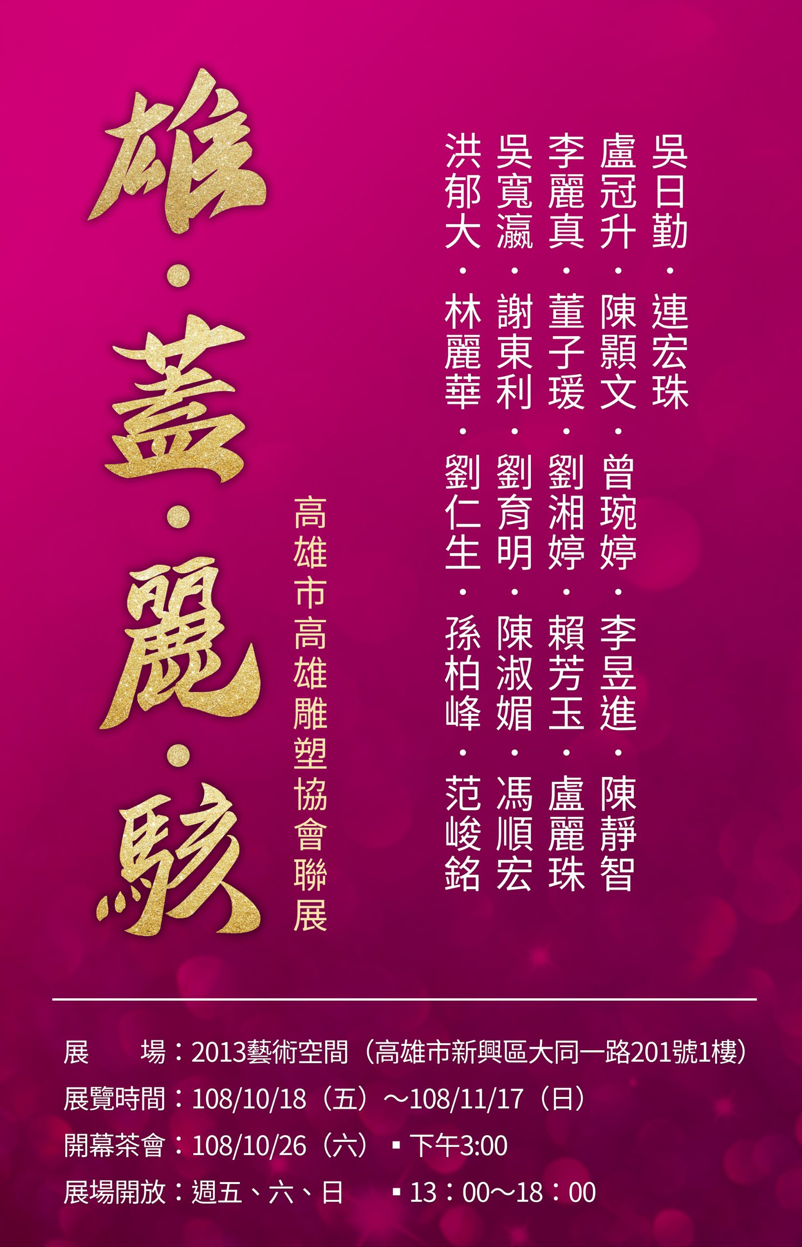 高雄雕塑協會聯展,主題—「雄‧蓋‧麗‧駭」,以在地高「雄」,涵「蓋」多元創作素材,多元創作面貌,呈現多面向的美「麗」視角,在藝術環境看似未顯熱絡的高雄地區,仍默默持續、反覆推送,一次次掀起看似平靜,內在卻不曾冷靜的驚濤「駭」浪(興起、騷動)。
