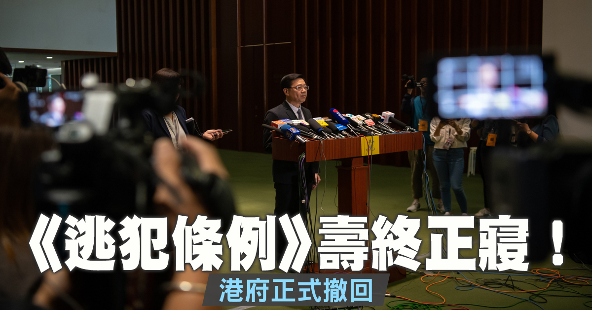 香港立法會召開大會,下午2點57分,針對《逃犯條例》修訂草案,展開撤回程序,引用《議事規則》撤回條例草案,《逃犯條例》正式壽終正寢。李家超發言僅僅只有2分鐘,隨即離開會議廳,3點01分完成整個程序,整個過程總共耗時5分鐘。
