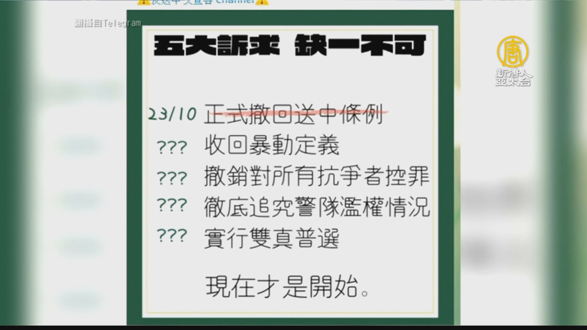 【新唐人亞太台 2019 年 10 月 23 日訊】好,再來看到,香港保安局局長李家超在立法會正式宣布,撤回修訂《逃犯條例》,來看反送中香港民眾的反應,有香港網友在Telegram貼出圖片指出,五大訴求、缺一不可,現在才是開始,也有不少香港網友在香港網上討論區(連登)強調,要自治、要真普選,以及解散警隊,刻不容緩!