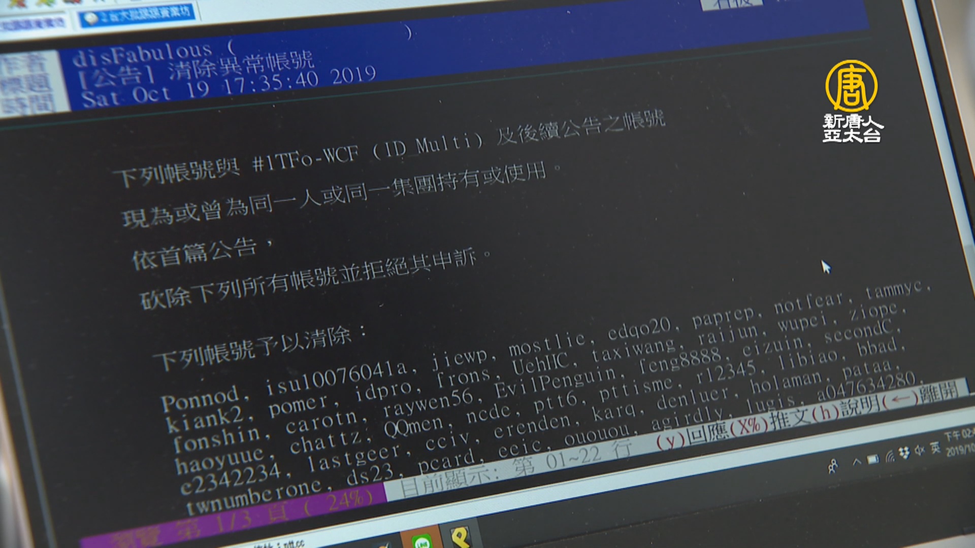 【新唐人亞太台 2019 年 10 月 24 日訊】台灣年輕人愛用PTT,討論八卦、政治議題,但中共卻藉此滲透統戰,疑似砸大錢,向鄉民買帳號!根據美國華府智庫GTI調查發現,PTT已經成為中共,傳播假訊息的主要工具,具有影響力的帳號,最高可以賣到20萬元,希望透過鄉民輿論,企圖影響台灣2020總統大選。