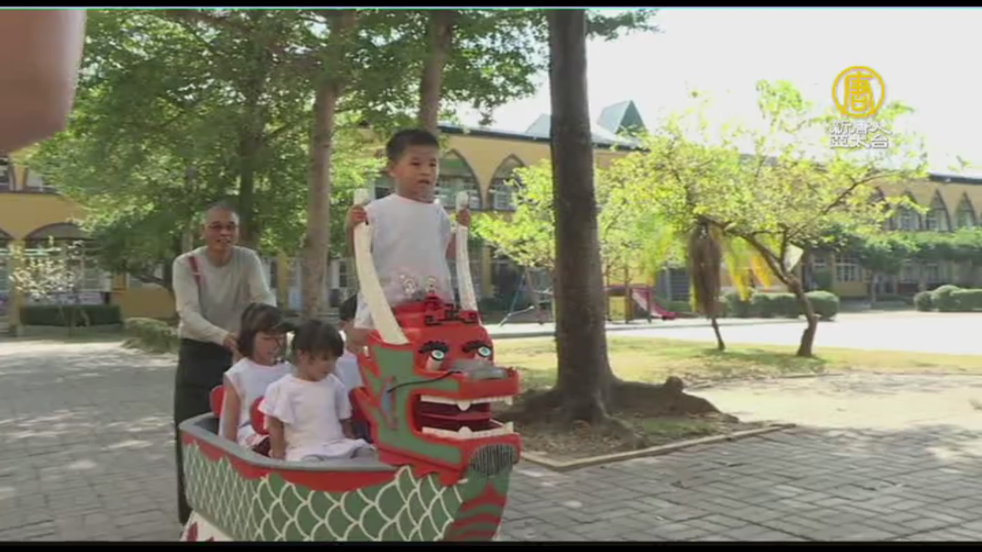 【新唐人亞太台 2019 年 10 月 24 日訊】鹿港一位木匠出身的周姓阿公,4年前為了孫子,用榫卯工法打造「大象娃娃車」,轟動全鹿港;如今孫子增加到4人,原有的「大象娃娃車」已經坐不下了,周右裕又花了一年時間再做了一台「龍船娃娃車」,在幼稚園允許之下進到校園,也讓其他同學試乘,分享這台全球獨一無二的娃娃車。