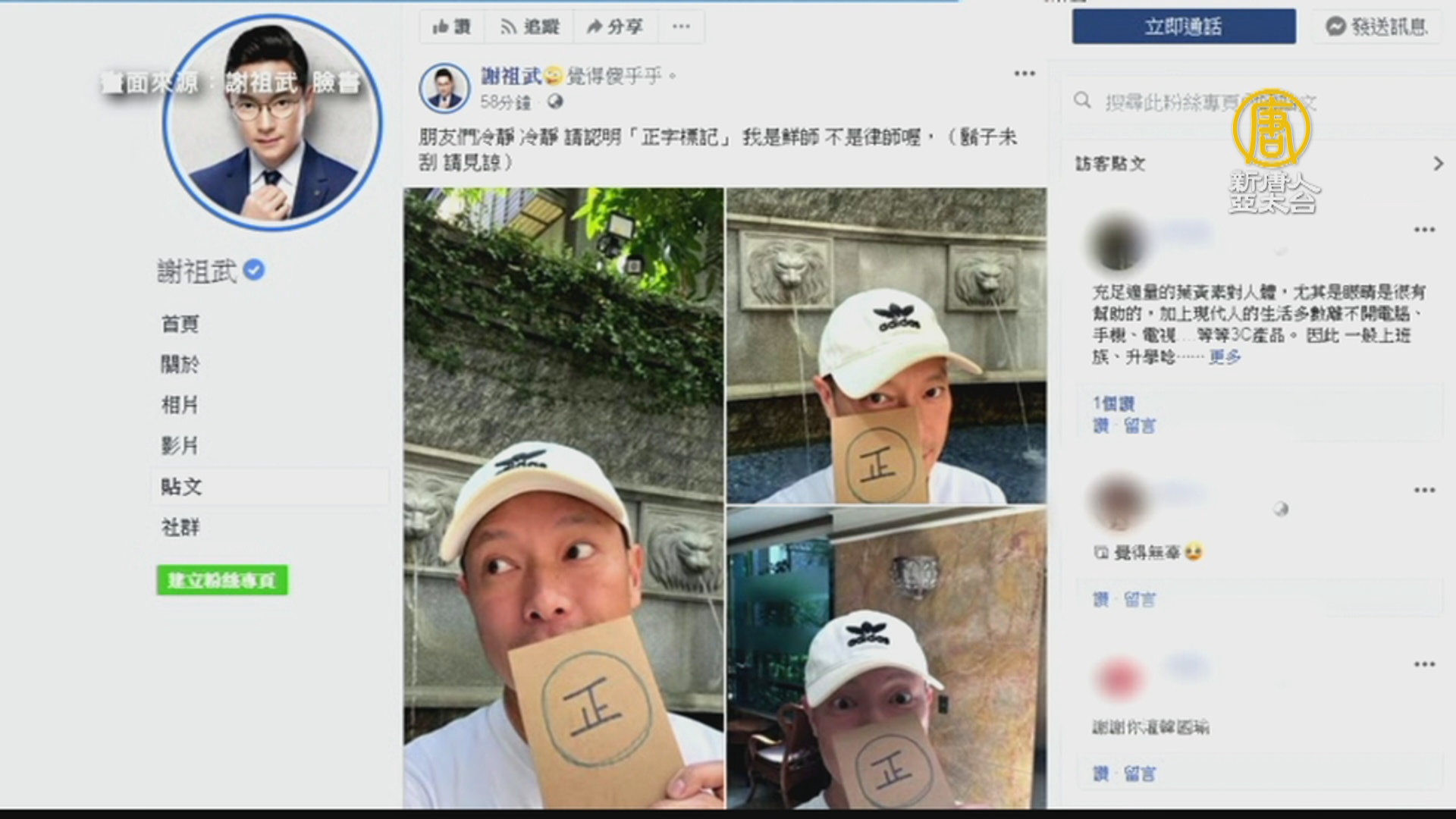 【新唐人亞太台 2019 年 10 月 25 日訊】知名律師謝震武,在政論節目上狂批韓國瑜10分鐘,引發韓粉不滿,湧入政論節目官方臉書批評謝震武,還有大量「韓粉」,跑錯地方,出征到藝人謝祖武臉書。藝人謝祖武的臉書被韓粉攻擊,也有許多網友留言,「謝震武謝祖武傻傻分不清楚」,謝祖武本人也幽默發文,他呼籲朋友們冷靜,請認明「正字標記」,他是鮮師,不是律師。