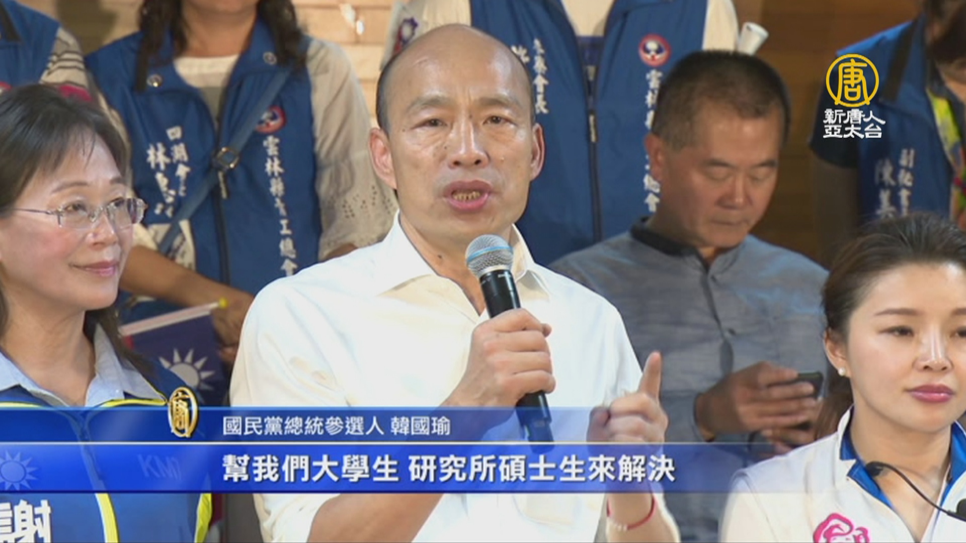 國民黨總統參選人 韓國瑜:「所有的費用,我身為總統的話,我一定會想辦法,幫我們大學生、研究所碩士生來解決,我們的孩子一定要跟國際接軌,大家說好不好。」