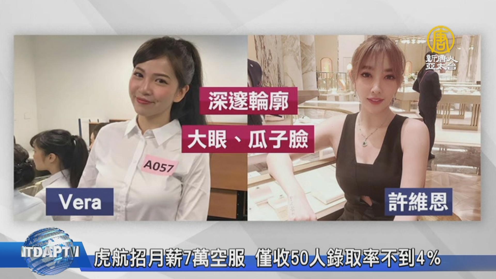 【新唐人亞太台 2019 年 10 月 26 日訊】歡迎回來,虎航因應明年開新航點,擴大機隊也徵空服,開出月薪7萬到7萬五,果然吸引5千人報名,初試篩選剩1300人,但只錄取50人,錄取率不到4%。裡面還有混血臉孔正妹,頂著明星臉跟高學歷來應試,希望一圓空姐夢。
