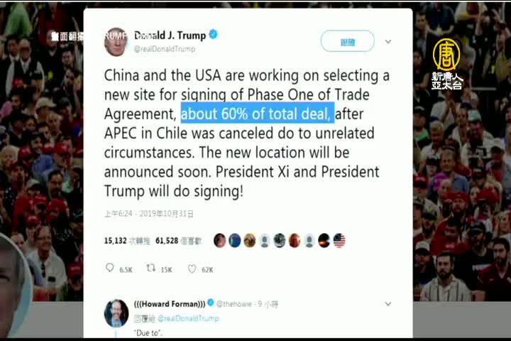 【新唐人亞太台 2019 年 11 月 01 日訊】早安新唐人,先來看到,在智利總統宣布取消11月主辦的APEC之後,美國總統川普週四(31日)表示,美中將很快宣布新地點,以簽署第一階段貿易協議。他還透露這部分協議內容,占整體協議的60%。中國商務部週四說,雙方主要貿易談判代表,將在週五將進行電話貿易對話。美國福斯新聞(Fox News)記者羅倫斯則在推特上發文,中方提出以澳門取代智利,作為這次協議的簽署地點。