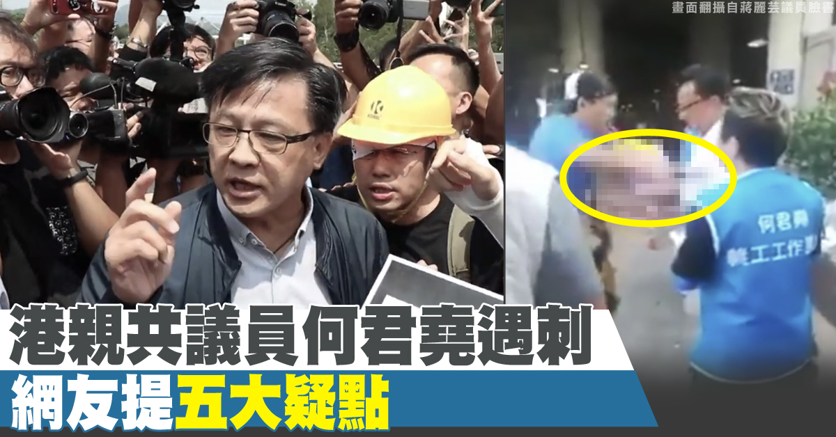 6日上午8點多,香港親共立法會議員何君堯,在屯門被人用刀襲擊受傷,但何君堯防範反應迅速,還能跟助手一起制服持刀者。網友提出五大疑點,包括拍片一氣呵成,從獻花到行動都有人紀錄,何君堯閃避反應太快,超乎常人,助選團等多人瞬間合力制伏施暴者,表現異常合拍,而被制服的施襲者也沒有激烈掙扎,選在鬧區行兇也不合常理。