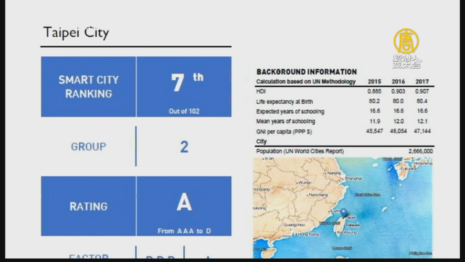 【新唐人亞太台 2019 年 11 月 07 日訊】2019 IMD全球智慧城市指數 調查報告。台北市總評比為A,全球排名第7,領先阿姆斯特丹、舊金山、溫哥華、雪梨、布拉格與東京等國際知名城市,此份評比中,台北市也是亞洲排名第2的「智慧城市」,僅次於新加坡;而亞洲排名第三的香港,則為全球第37名。