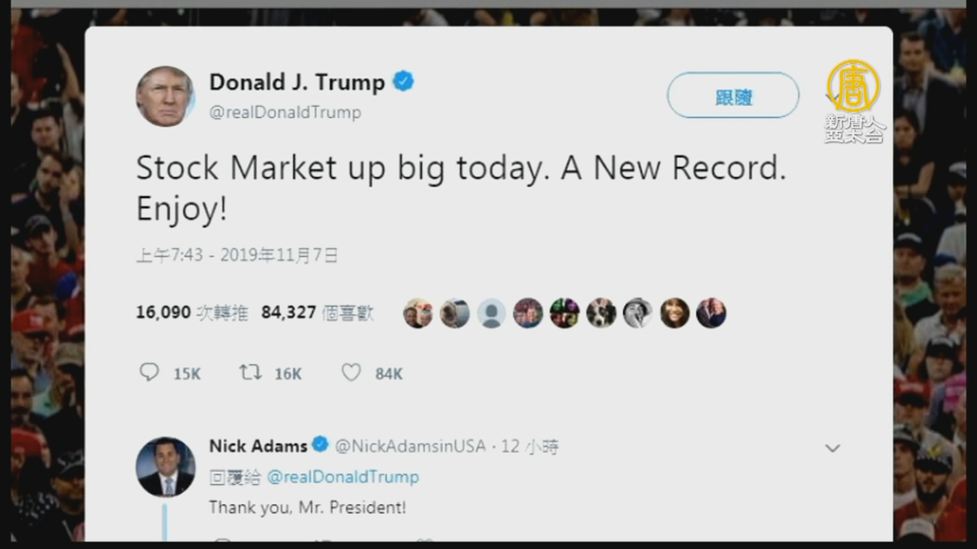 2019-11-08 08:56:02早安新唐人先來關心,美中貿易戰進展。昨天傍晚,路透社報導,中共商務部發言人高峰表示,美中雙方同意隨著協議進展,分階段取消加徵關稅。但中方沒有透露時間表。消息讓美股道瓊與標普500指數,週四收盤時,雙雙締造歷史新高,而美國總統川普則是在推特上寫到,「今天股市大漲,創新記錄,請享受」。不過,川普沒有在推特上證實是否同意逐步撤關稅,外媒路透社發出兩篇報導,第一篇寫到,一名美國官員證實,美國與中國已同意取消加徵關稅。但第二篇寫到,白宮及外部顧問表示強烈反對。