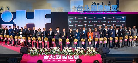 總統蔡英文、中央代表、各國駐台使節、旅遊官方等,為台北國際旅展開幕剪綵。(擷取自ITF台北國際旅展粉絲專業)