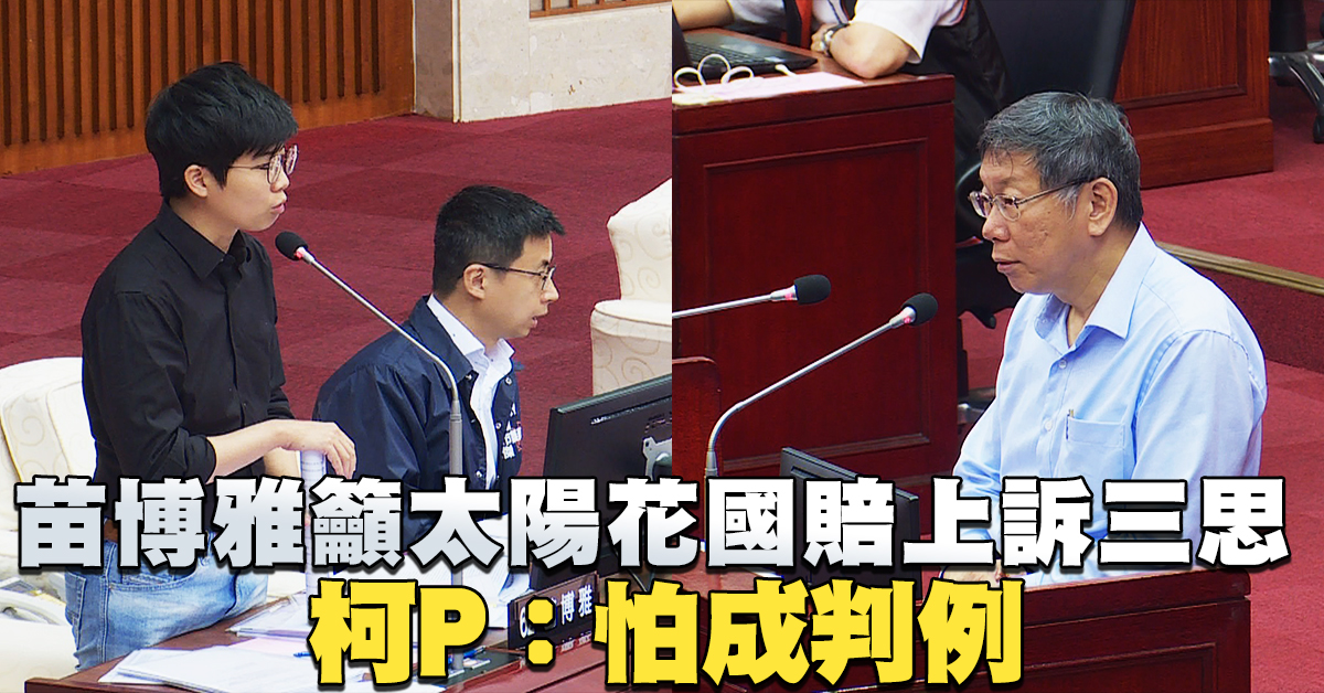 太陽花運動行政院驅離案日前宣判,北市警局應賠償受傷人士新台幣111萬多元,北市警局日前在備詢時曾表態,此案會上訴,對此,市議員苗博雅12日在質詢時直接詢問台北市長柯文哲,是否覺得法院的判決有不妥?