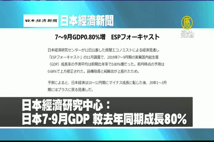 【新唐人亞太台 2019 年 11 月 13 日訊】來看到日本經濟新聞報導:日本經濟研究中心表示,日本7到9月GDP 較去年同期成長80%。