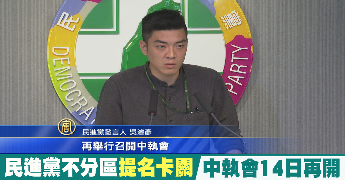 民進黨發言人 吳濬彥:「因為不分區提名委員會的這些相關作業,都還在進行當中,所以經現場中執委一致同意,就是我們會進行休息,延至明日的上午11點半的時候,再舉行召開中執會,然後來通過不分區的委員。」