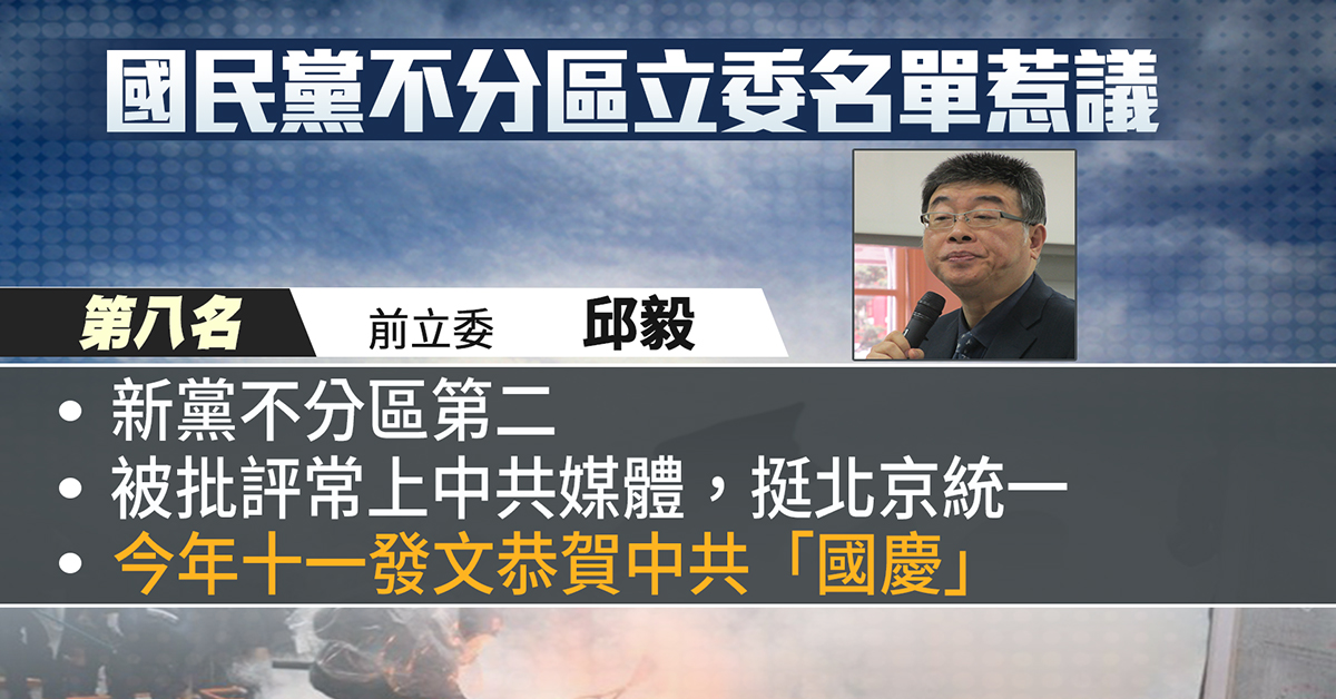 第八名前立委邱毅,被批評常上中共媒體,支持北京武力統一,今年十一發文恭賀中共所謂「國慶」。葉、邱兩人,曾列支持「一國兩制」的新黨2016不分區名單一、二名。