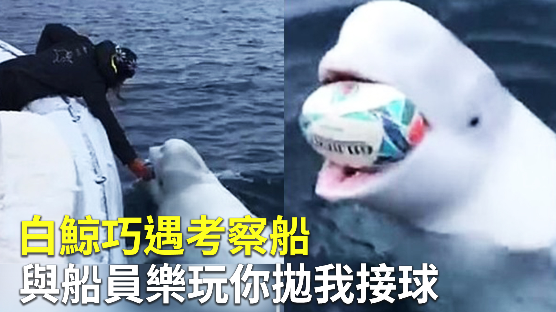 白鯨巧遇考察船 與船員樂玩你拋我接球