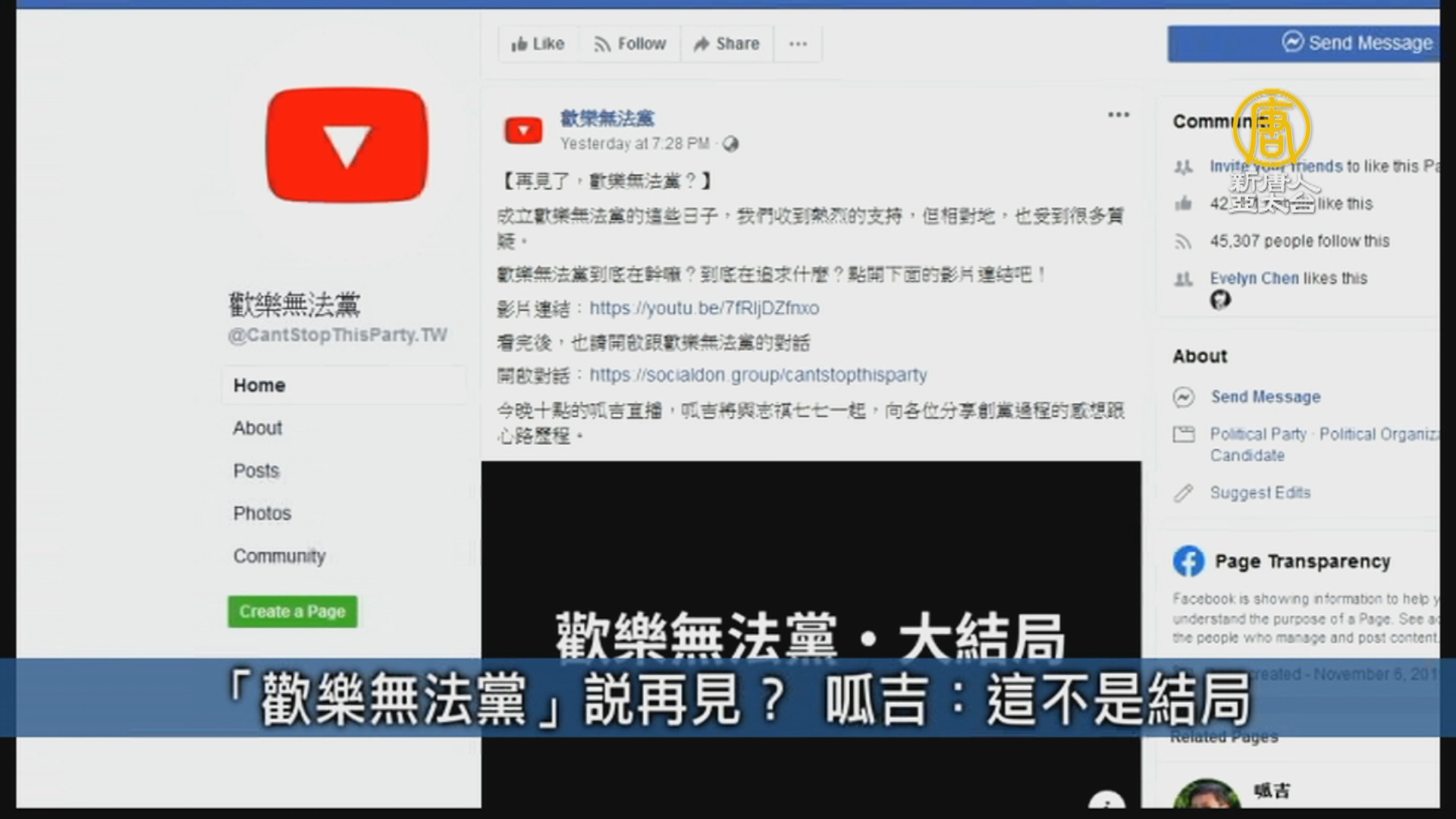 由台北市議員邱威傑(呱吉)等人籌組歡樂無法黨臉書發文提及「再見了,歡樂無法黨?」引發討論。由於周五就是2020大選登記截止日,他們表示很可惜在這天,政黨還未正式通過成為法人,與本屆大選錯身而過。但呱吉強調「這不是結局」,成立政黨是想傳達大型公民教育課程理念,不是要投入明年選舉。
