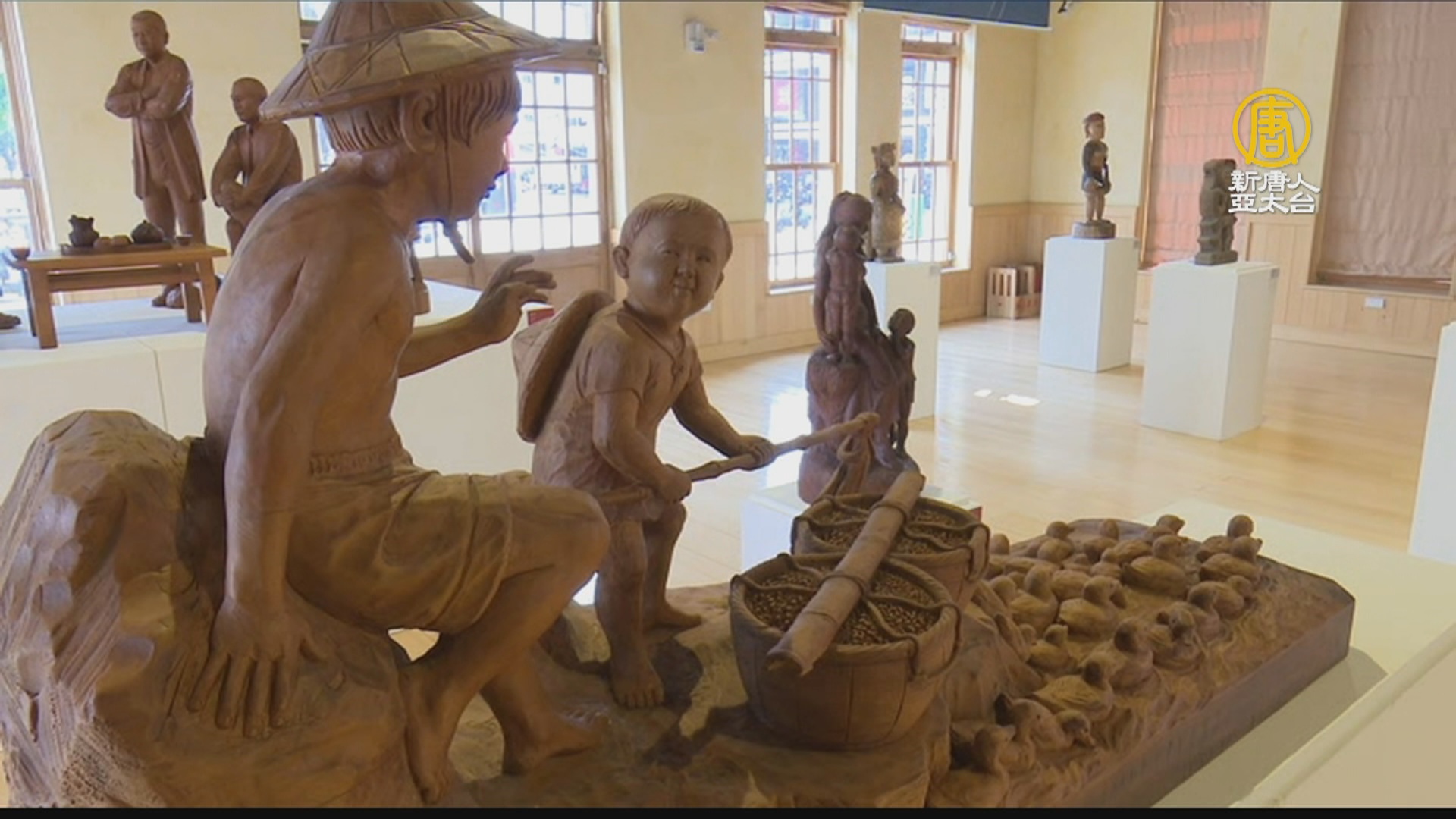 爺孫共同養鴨、仲夏之夜三五好友敘舊,每個人物刻像都栩栩如生,木雕師蔡明海,將懷念家鄉的生活,詮釋在作品裡。