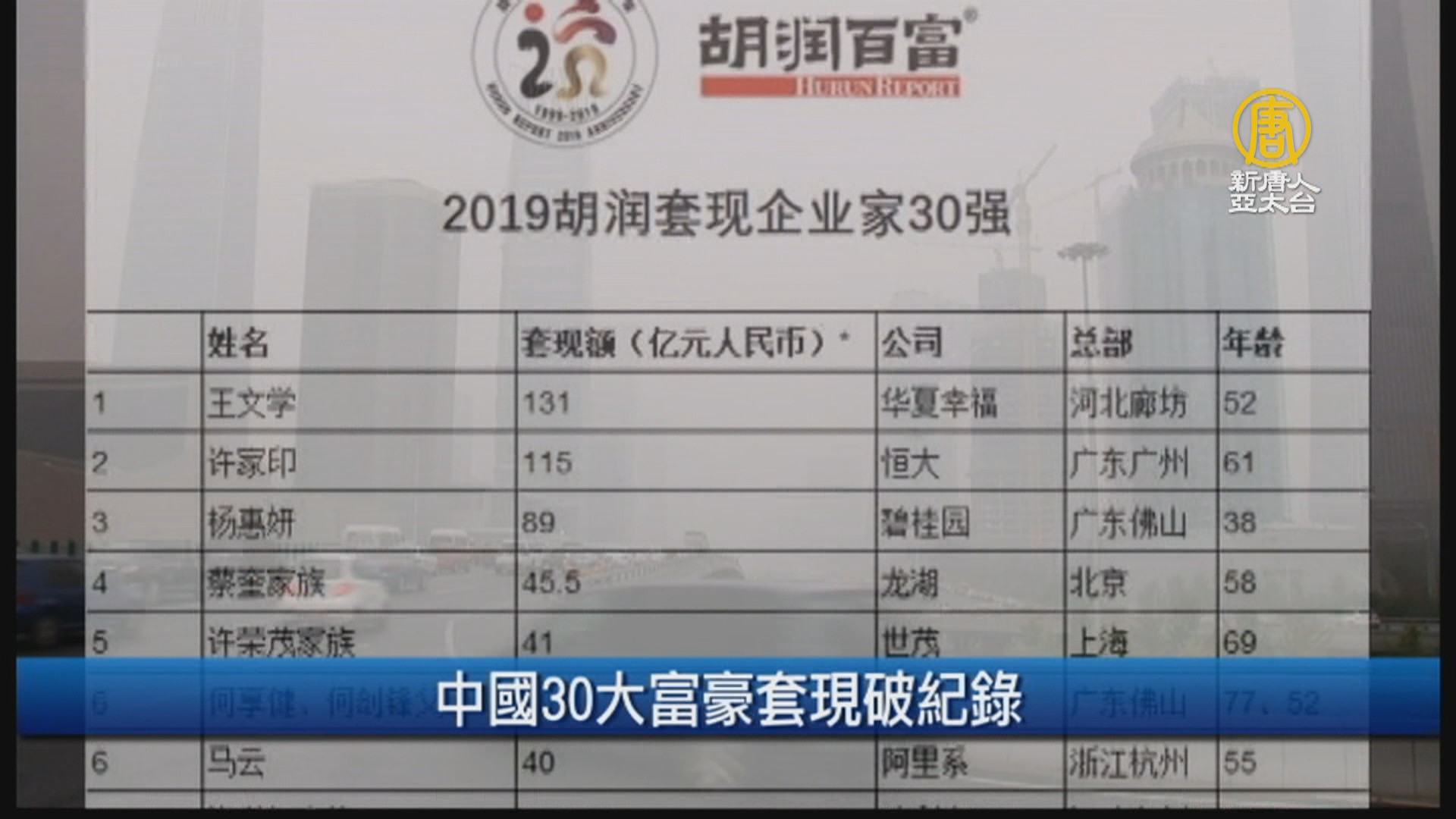 中國胡潤研究院發布「2019年胡潤套現企業家30強」報告,顯示從去年7月至今年9月,中國30名超級富豪合計套現918.5億人民幣,年增10%,創下歷年最高,其中地產商占37%。針對中國富豪轉移資產的行動,有分析師認為,這代表富豪看衰中國經濟前景。