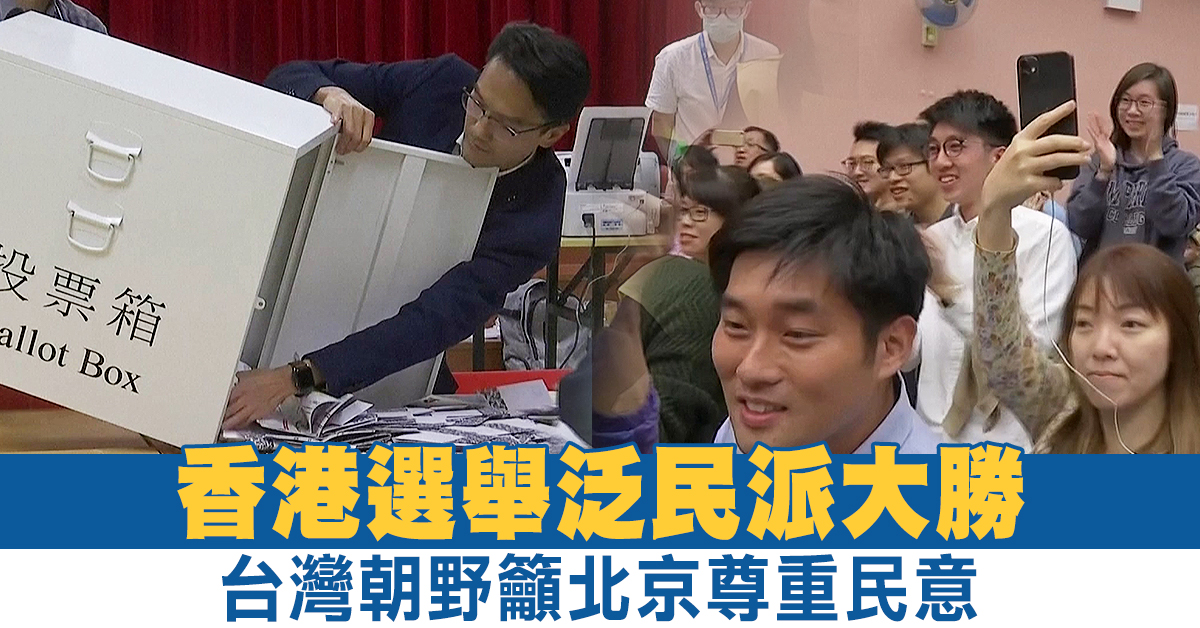 香港24日舉行區議會選舉,結果香港泛民主派大勝,代表親中共勢力的建制派慘敗,接下來可望進一步影響下屆特首選舉,對此,台灣朝野都同聲讚揚民主結果,並也都呼籲當權者,要尊重民意。