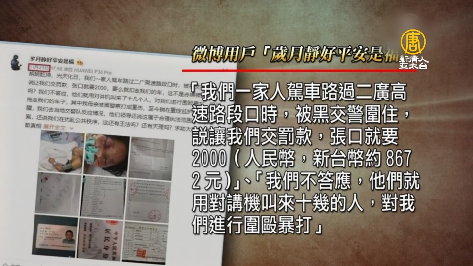 該用戶在11月21號發文說:他一家人駕車路過二廣高速路段口時,被黑交警罰款2000元,不答應就進行圍毆暴打,他母親被打成重傷,他痛批「還有王法嗎?還有天理嗎?」