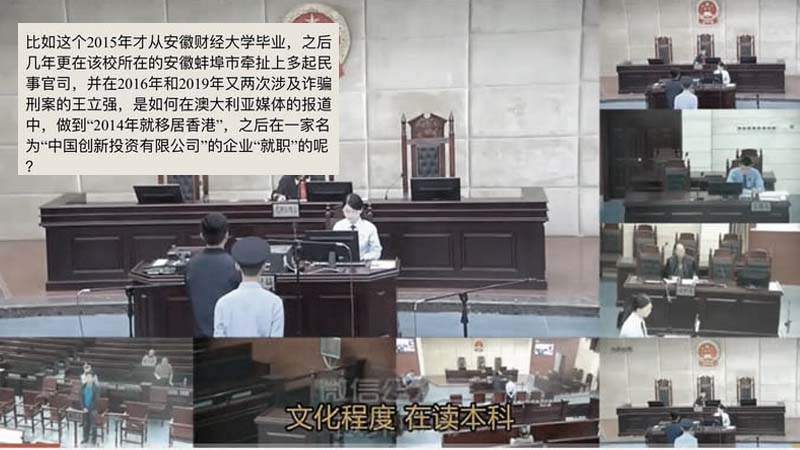 不過,在這8個畫面中,僅有一個子畫面是從被告「王立強」的側上方遠距離拍攝到其臉部,臉部顯得十分模糊。而在主畫面最後,「王立強」被法警帶離被告席時,有不到2秒鐘的時間看到其正面,臉部特徵與日前在澳洲媒體自稱中國間諜的「王立強」有幾分相像。