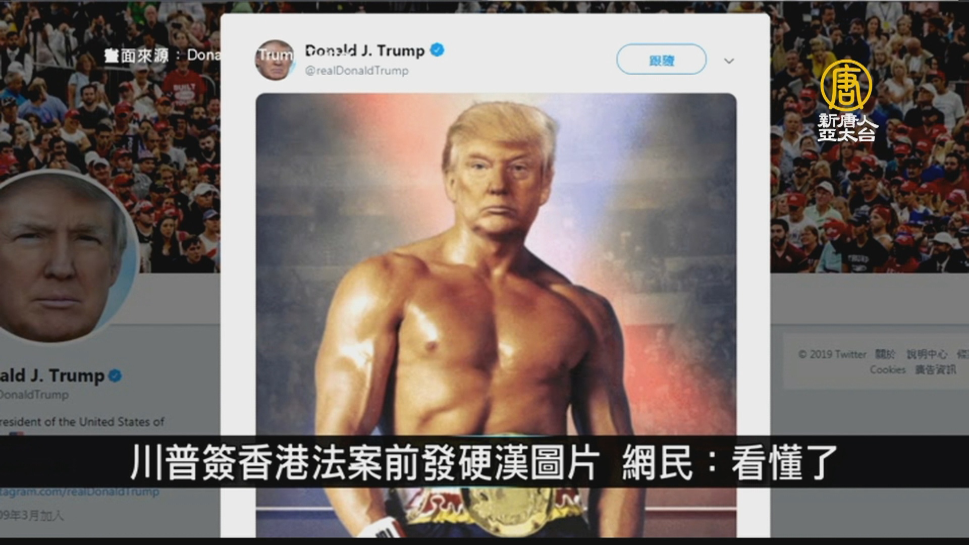 【新唐人亞太台 2019 年 11 月 28 日訊】川普簽香港法案前發硬漢圖片 網民:看懂了