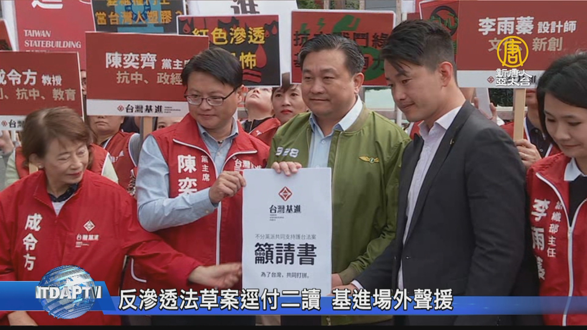 【新唐人亞太台 2019 年 11 月 29 日訊】立法院會29日處理,民進黨立院黨團提出的反滲透法草案逕付二讀,藍綠都祭出甲級動員令。台灣基進則在立法院外,召開記者會,聲援反滲透法草案。