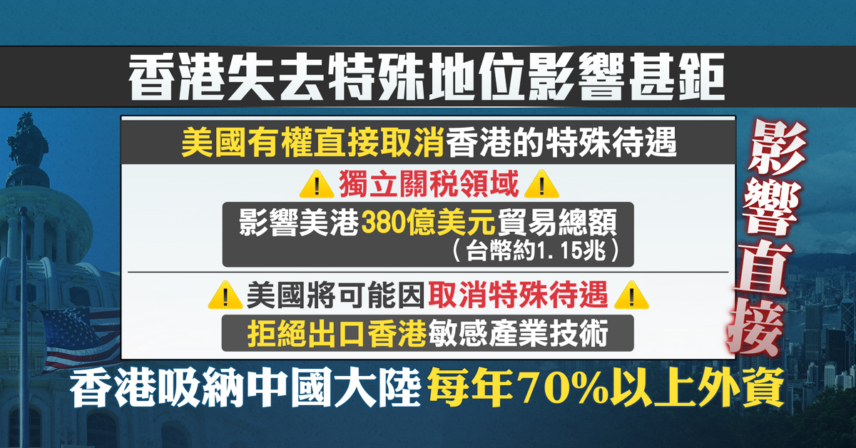 法案核心,美國有權直接取消香港的特殊待遇,包括獨立關稅領域,影響美港380億美元的(台幣約1.15兆)貿易總額;美國將可能因取消特殊待遇,而拒絕出口香港敏感產業技術,尤其香港吸納中國大陸每年70%以上外人直接投資,對中國影響更直接。