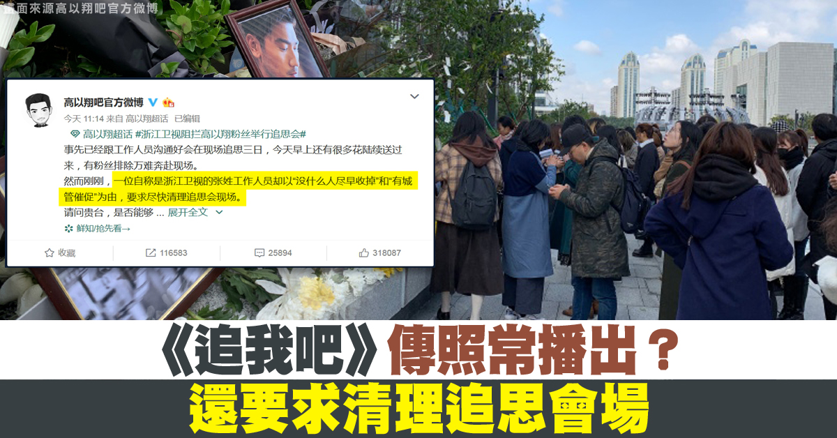 【新唐人亞太台 2019 年 11 月 29 日訊】台灣男星高以翔,27日在大陸錄製浙江衛視節目《追我吧》不幸猝逝,事後傳出該節目將停播,但今天有網友發現浙江衛視29日的節目表,顯示晚間9點將照常播放《追我吧》,似乎沒有受到高以翔事件影響,引發不少網友強烈反彈。直到下午,浙江衛視才發聲明表示,正在全力以赴處理善後工作,今晚原本《追我吧》時段調整為播出電視劇精編。另外,高以翔粉絲昨天發起3天的追思活動,在他錄製節目的現場擺放1千朵菊花,但高以翔的官方微博今天貼文說,一位自稱是浙江衛視的張姓工作人員卻以「沒什麼人儘早收掉」和「有城管催促」為由,要求儘快清理追思會現場。引發粉絲撻伐聲浪不斷。
