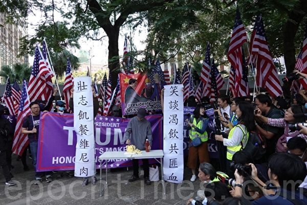 現場民眾多數或拿著美國國旗,或拿著「天滅中共」的標語。期間,主持人拿出改寫岳飛《滿江紅》的詞句「壯志飢餐維尼肉,笑談渴飲共匪血」作對聯,用以明志。