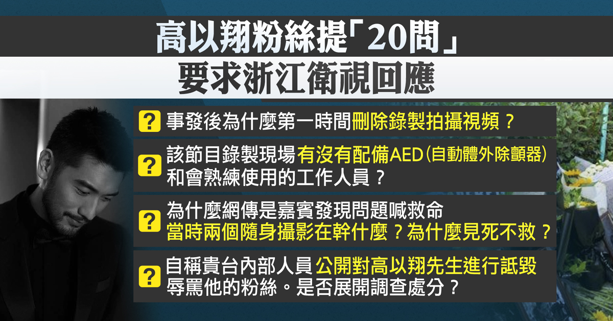 高以翔粉絲以20個問題,質問浙江衛視,包括:「事發後為什麼第一時間刪除錄製拍攝視頻?」、「該節目錄製現場有沒有配備AED(自動體外除顫器)和會熟練使用的工作人員?」、「為什麼網傳是嘉賓發現問題喊救命,當時兩個隨身攝影在幹什麼?為什麼見死不救?」、「自稱貴台內部人員公開對高以翔先生進行詆毀,辱罵他的粉絲。是否展開調查處分?」