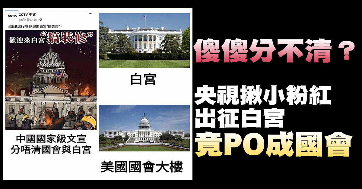 中共官媒央視(CCTV)4日在臉書PO文,稱美國簽署通過香港人權與民主法案,呼籲網友「歡迎來白宮『搞裝修』」,不過,有眼尖的網友發現,附上的圖片竟是美國國會大廈而非白宮,儘管CCTV中文網在隔天中午已經刪文,但消息已經在香港網上傳開,連香港眾志秘書長黃之鋒都轉圖嘲諷。