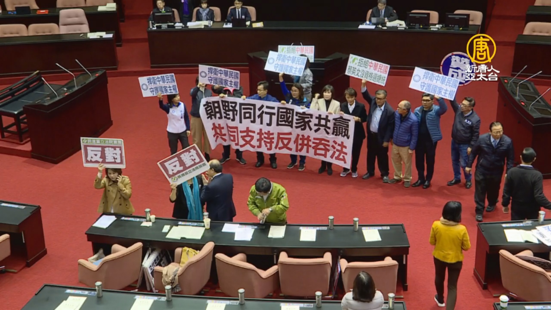 國民黨立委曾銘宗,舉牌抗議,卻不小心念錯,引起一片譁然,眼看民進黨推「反滲透法」逕付二讀,國民黨也推自家版本「反中華民國併吞法」闖關,還一早召開黨團大會,甲級動員備戰。