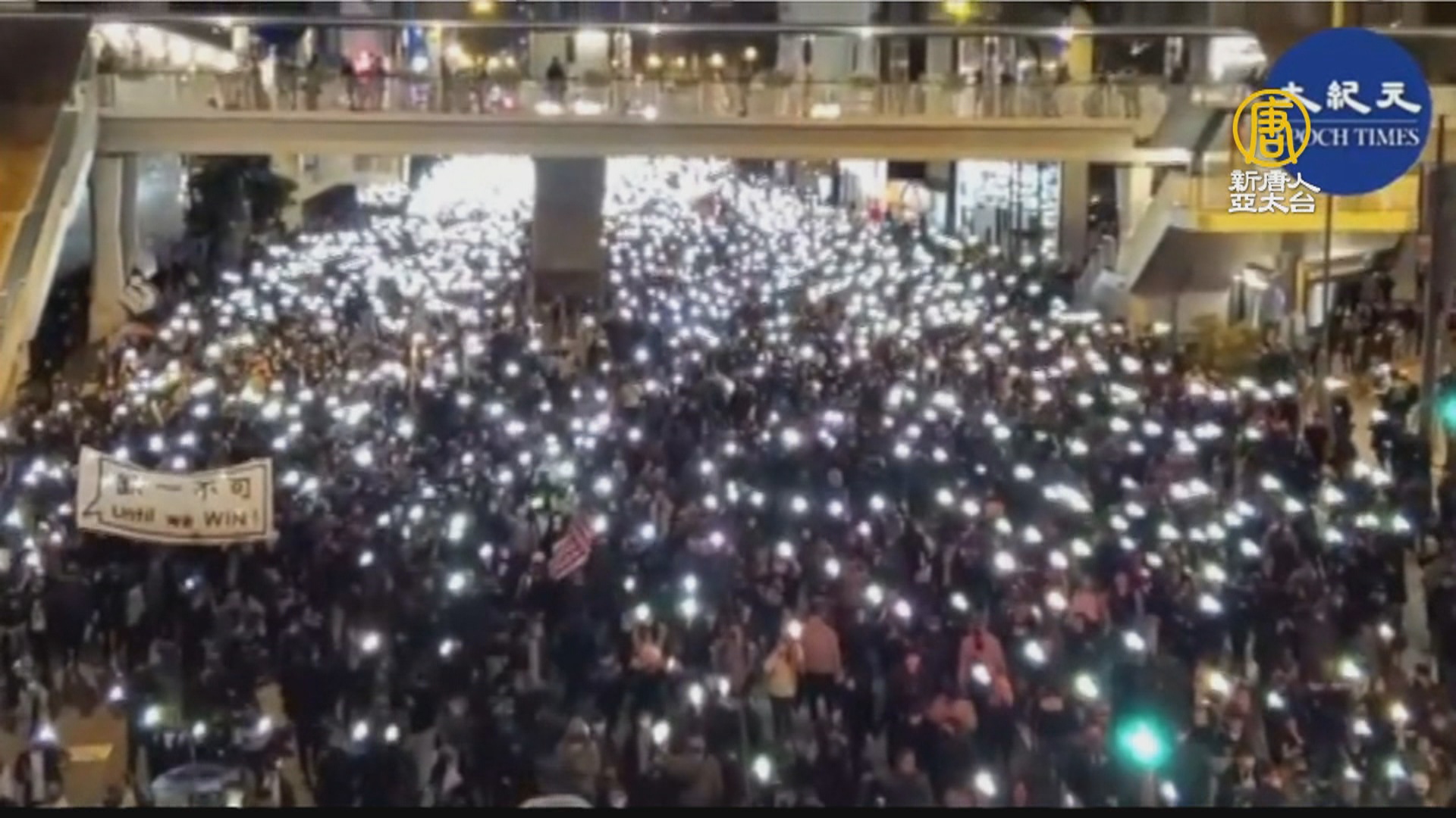 【新唐人亞太台 2019 年 12 月 09 日訊】早安新唐人,先帶您關心,香港民陣(民間人權陣線)在12月10日的國際人權日前夕(8日)),周日再度發起遊行,並獲得港警批准,超過80萬港人走上街頭,大喊「驅除共黨 還我香港」等口號,入夜後,再現遊行「燈海」。