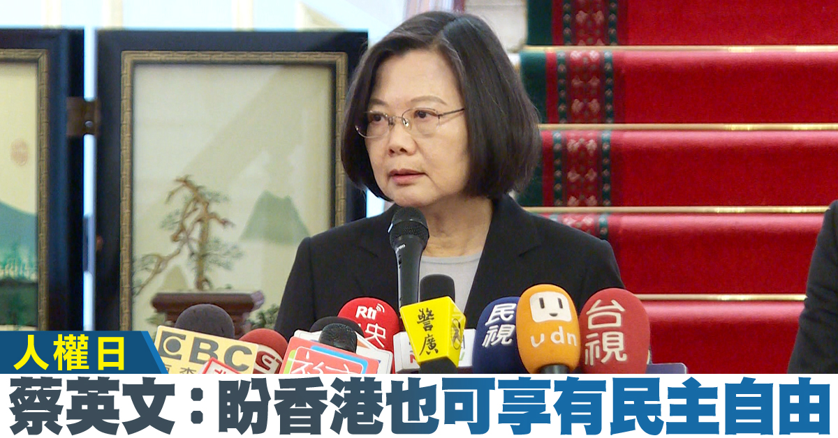 中華民國總統 蔡英文:「我們希望台灣現在享有的民主自由,那香港有一天也可以有這個民主自由,但是香港正在發生的事情,也讓台灣人有所警覺。」