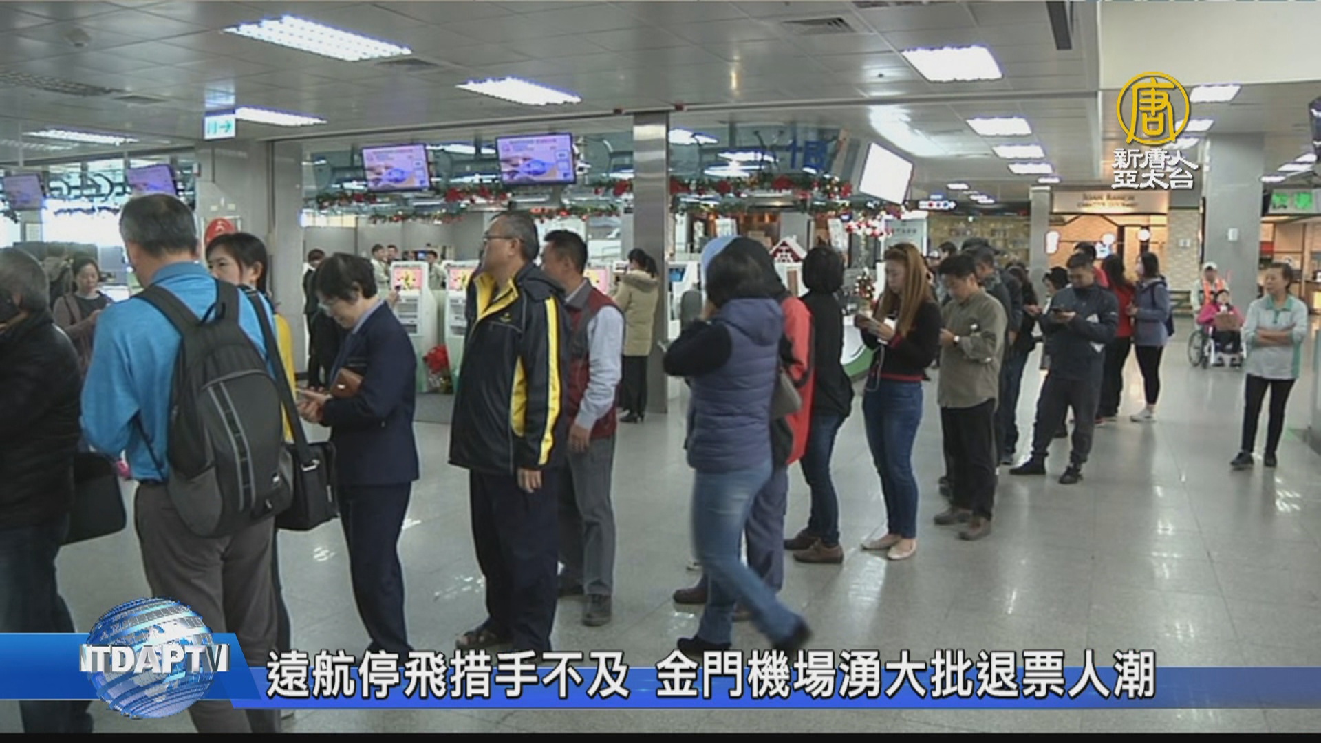 【新唐人亞太台 2019 年 12 月 12 日訊】遠東航空今天突然宣布明天起停飛,行政院副院長陳其邁表示,民航局及交通部都有掌握,相關權責部會都會啟動應變機制,最重要的是確保旅客及勞工權益。而一聽到遠航停飛的消息,金門機場下午立即湧現大批退票人潮,金門縣政府也成立緊急應變小組,請民航局協調其他航空公司增加航班因應。