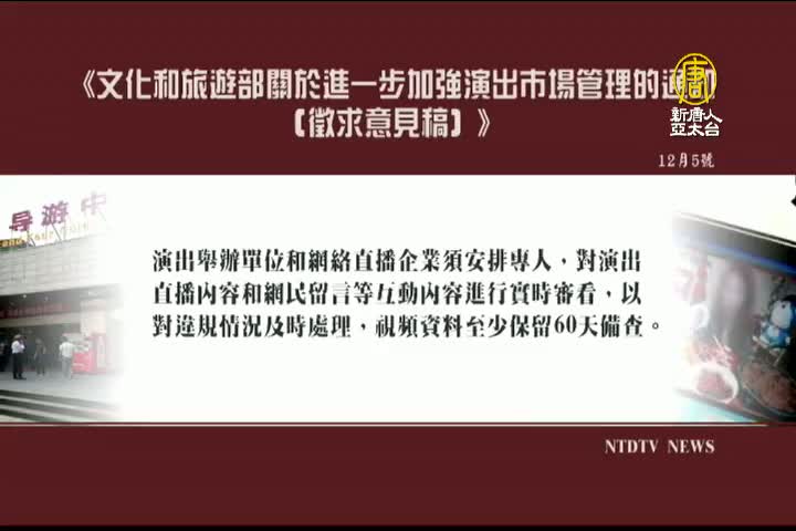 【新唐人亞太台 2019 年 12 月 13 日訊】中共文化和旅遊部近日發布通知,要求加強演出活動管理,其中,要求網路直播採取延遲播出形式,至少延播3分鐘,引發熱議。有網友指出,延播是為了審核內容,中共害怕人民了解真相。