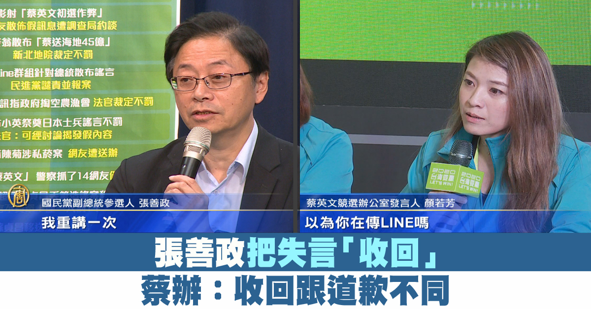 不過,對於張善政把話收回的作法,蔡英文競辦發言人顏若芳並不認同,要求張善政道歉,認為這不是副總統參選人,失言應該有的態度。