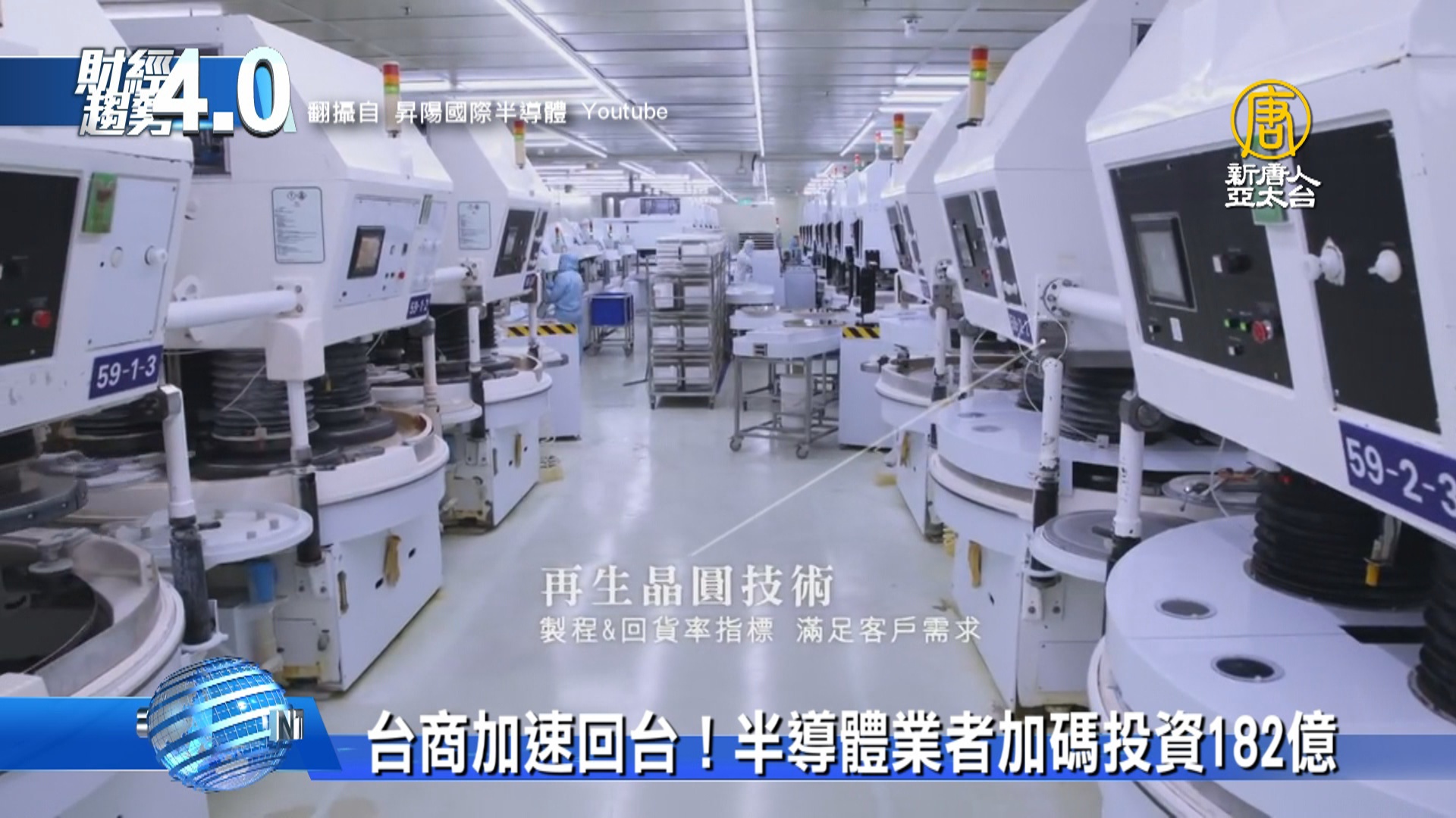 【新唐人亞太台 2019 年 12 月 14 日訊】歡迎回來。在美中貿易戰、國際情勢影響下,台灣產業鏈逐步回流,投資台灣事務所本周通過,三大業者投資案,封測廠華泰電子回台投資,昇陽和穩懋,以根留台灣方案加碼,總計三家業者投資182億,半導體業者投資台灣可以說是 相當積極。