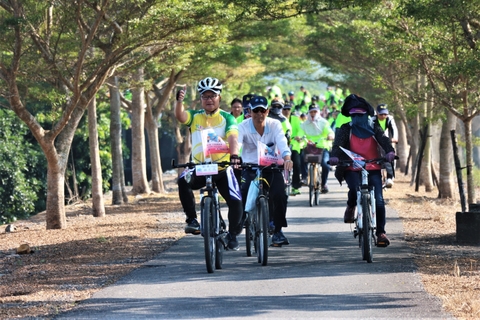 鄉長林志成高聲呼完口號「我六堆、要團結」、「我新埤、我感動」,帶領屏東縣新埤鄉近400多位村民與來自客家六堆民眾踩著單車,前往鄉內新埤、建功、打鐵、南豐、萬隆、餉潭、箕湖七村進行遶境巡鄉(屏東縣府提供)
