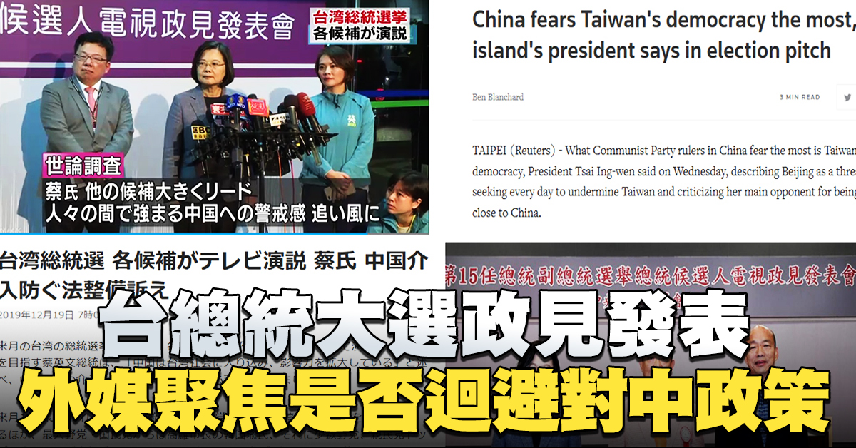 其中日經新聞報導,現任台灣總統蔡英文以香港反送中運動為例,說明「民主和威權是衝突的,兩個制度不可能共存在一個國家」。日經說,國民黨候選人韓國瑜,立場親近中共當局,可能成為台灣人民的疑慮。日本產經新聞報導,政見會他迴避了「對中政策」問題,集中火力攻擊蔡英文政府「腐敗」。