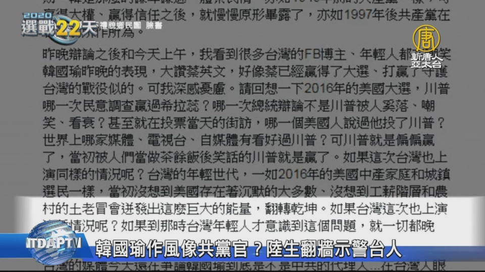 【新唐人亞太台 2019 年 12 月 20 日訊】總統候選人韓國瑜、蔡英文與宋楚瑜,18日進行首場政見發表會,一名中國大陸學生跨海投書粉專,表示當晚翻牆,全程給父母播放了這場政見會。並表示對藍綠只有一條標準:誰反共最堅決,就對誰有好感。