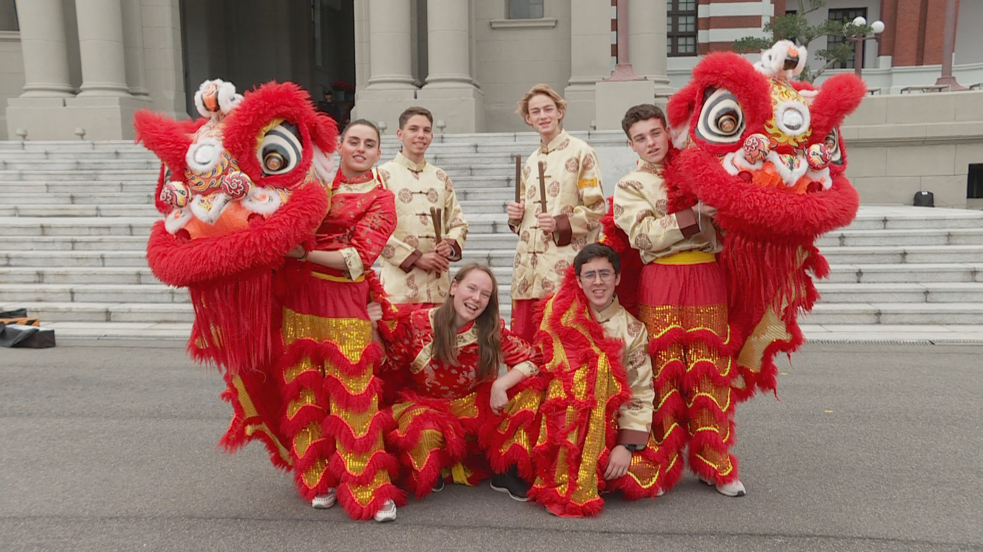 舞獅跟著鼓聲前進,靈活眨著雙眼,充滿中華傳統喜氣的表演,將登上明年1月1日總統府升旗典禮,卸下獅頭,原來全都是外國人。