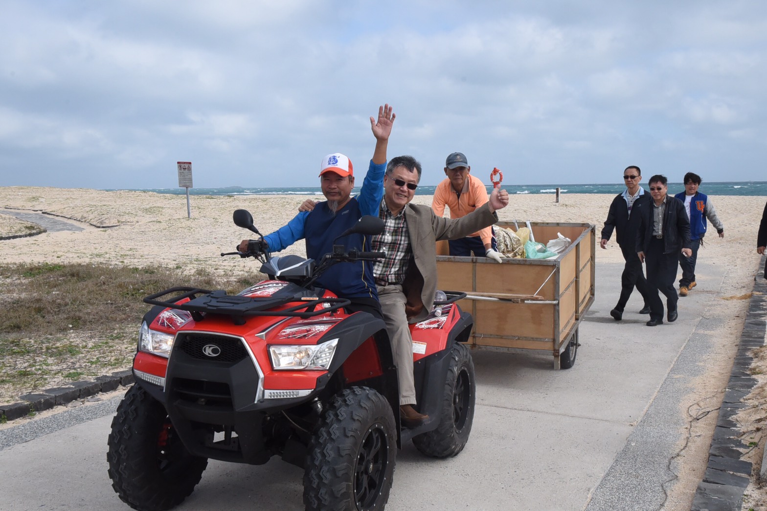 縣政巡禮,賴峰偉搭上龍門村長清運海廢的沙灘車。(圖/澎湖縣政府提供)