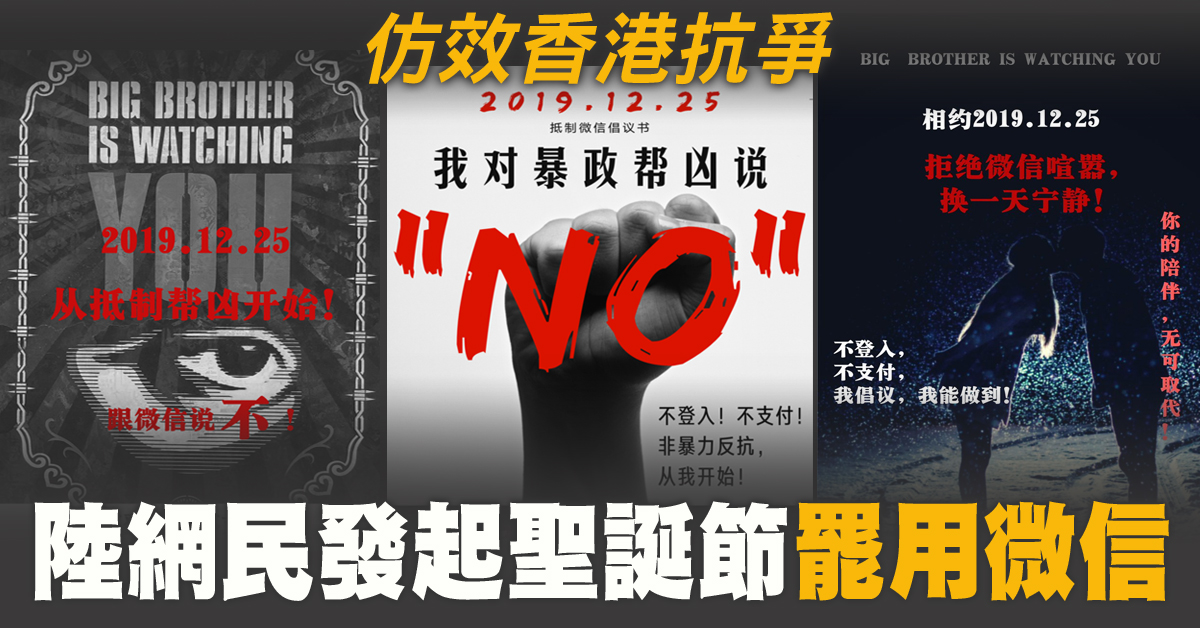 中共要求民眾從網絡到社區都不過聖誕節,有網民發起「聖誕快樂,抵制微信」的全民非暴力行動試水。網民們相約在聖誕節這一天做到:不登錄、不支付,呼應香港「反送中」抗爭運動,並喚起公民意識,為即將到來的抗爭浪潮做足準備。